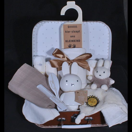 - Een roestbruin koffertje met Nijntje en de tekst: “Kiekeboe ik kom logeren”. 30cm – 21cm – 9cm. Het koffertje is gemaakt van stevig karton, aan elkaar geregen met garen en de randen, de sluiting en het handvat zijn van metaal. De koffertjes zijn kidsproof en super leuk om ergens in huis een plekje te geven of spulletjes van de kleine in te bewaren.