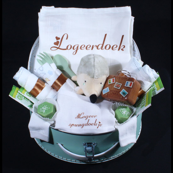 Een mooie witte hydrofiele met de tekst “Logeerdoek” luier om te gebruiken als afdroogdoek of om de kleine op de verschonen. Altijd handig om zo’n logeerdoek in huis te hebben